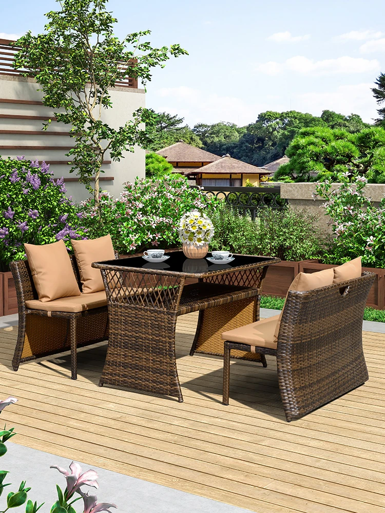 紫葉の庭に最適!おしゃれなアウトドアダイニングテーブル&チェアセット - 防水仕様で安心のリラックス空間を実現!テラスやバルコニーにぴったりのラタンチェア付き。お庭を彩る素敵なアイテムです!