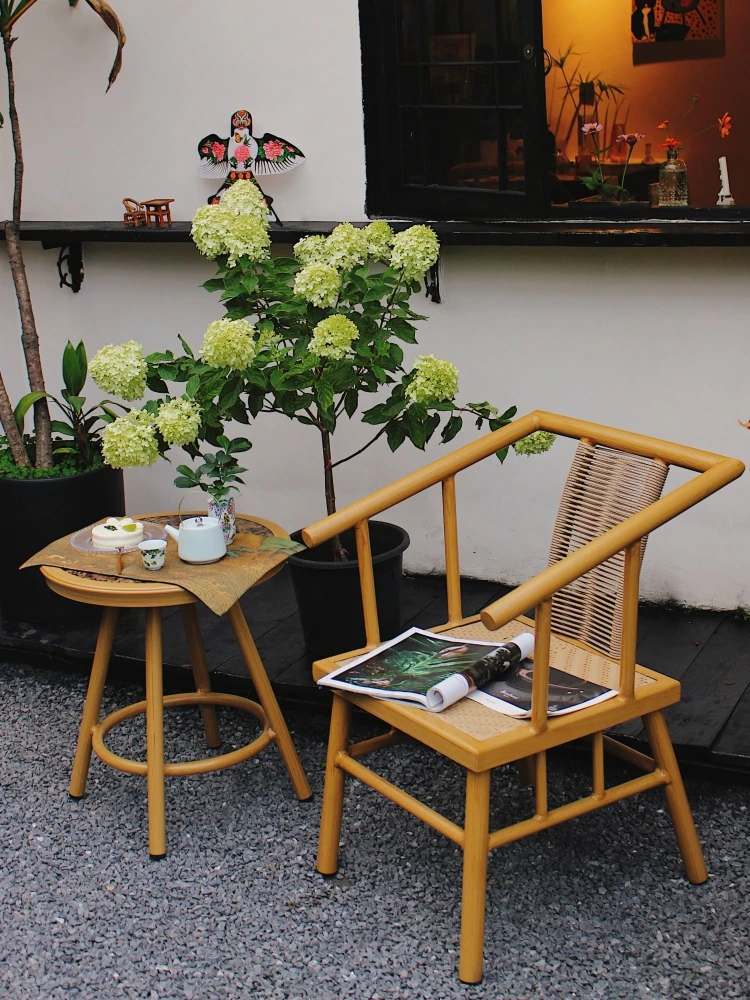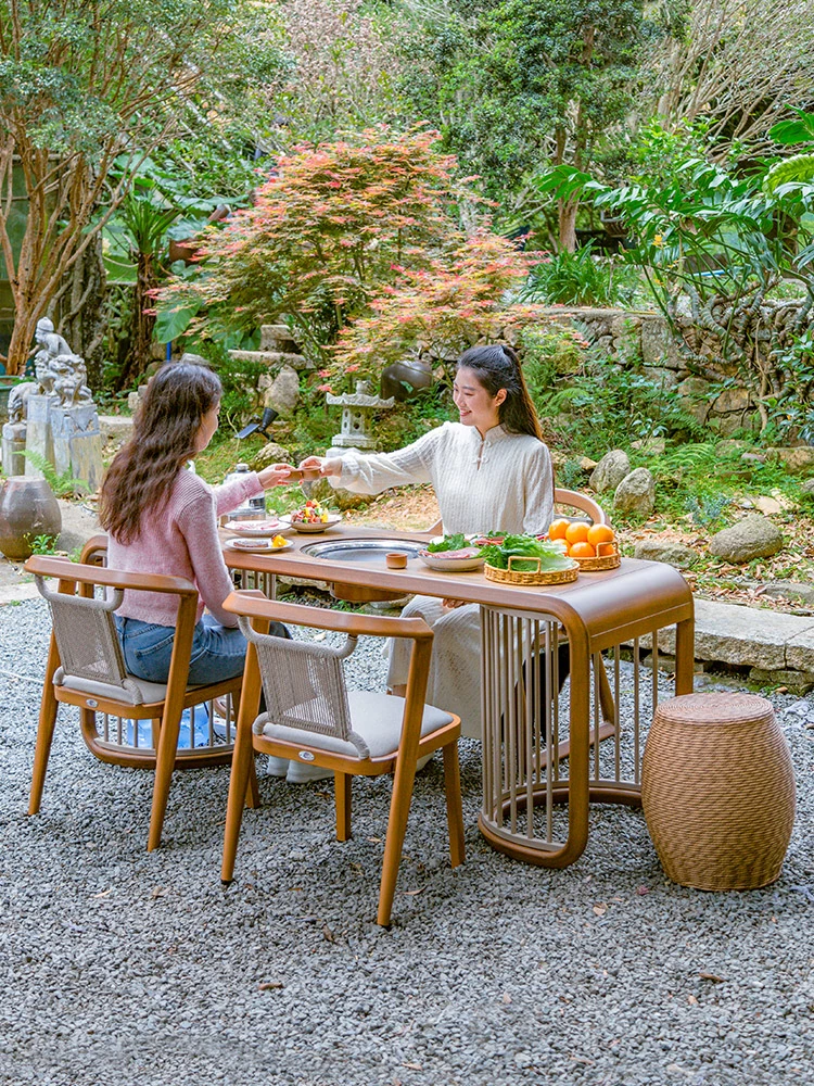 紫色の葉の庭にぴったりな新中式スタイルの囲炉裏茶卓セット!アウトドアでの煮茶やバーベキューにも最適なリラックス空間を演出。おしゃれで使い勝手抜群の茶卓椅子コンビネーションで、特別なひとときをお楽しみください。