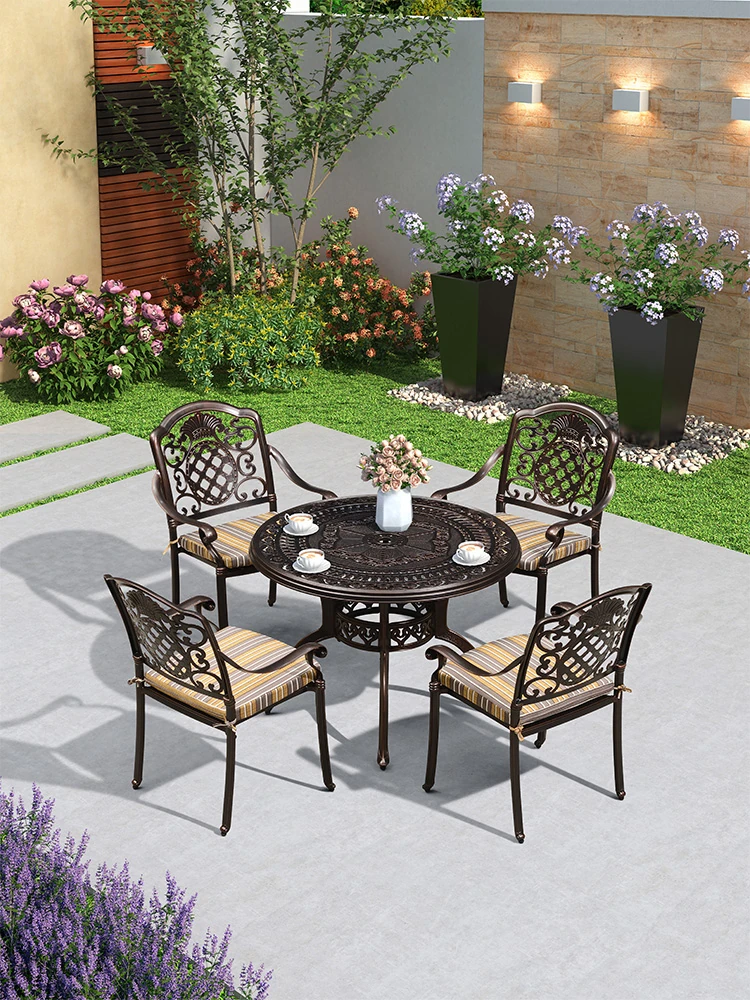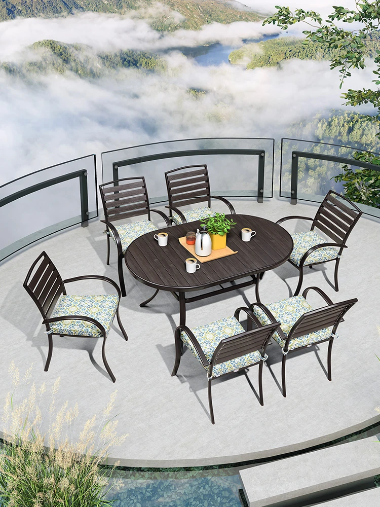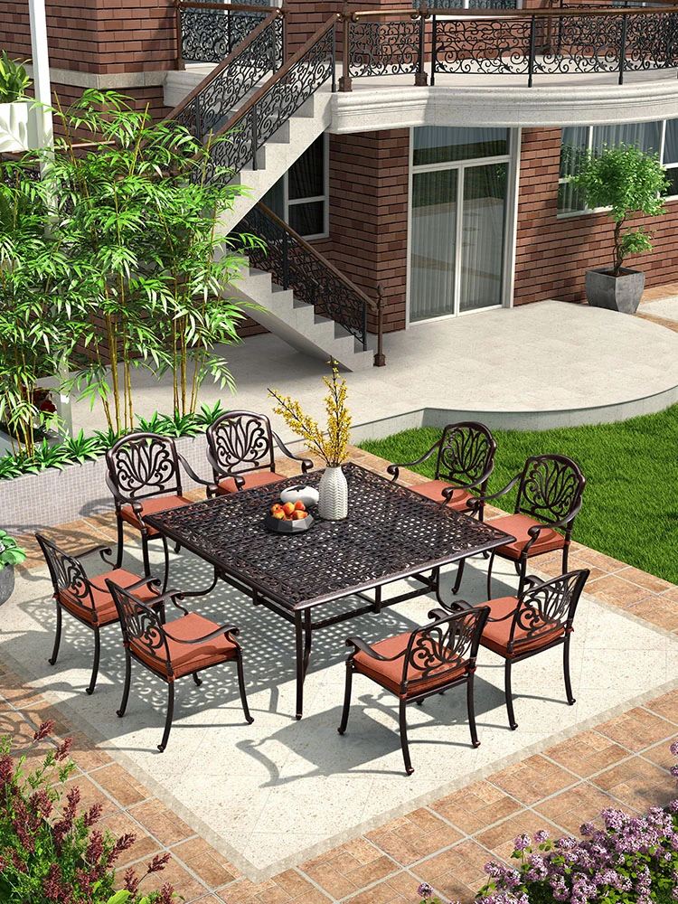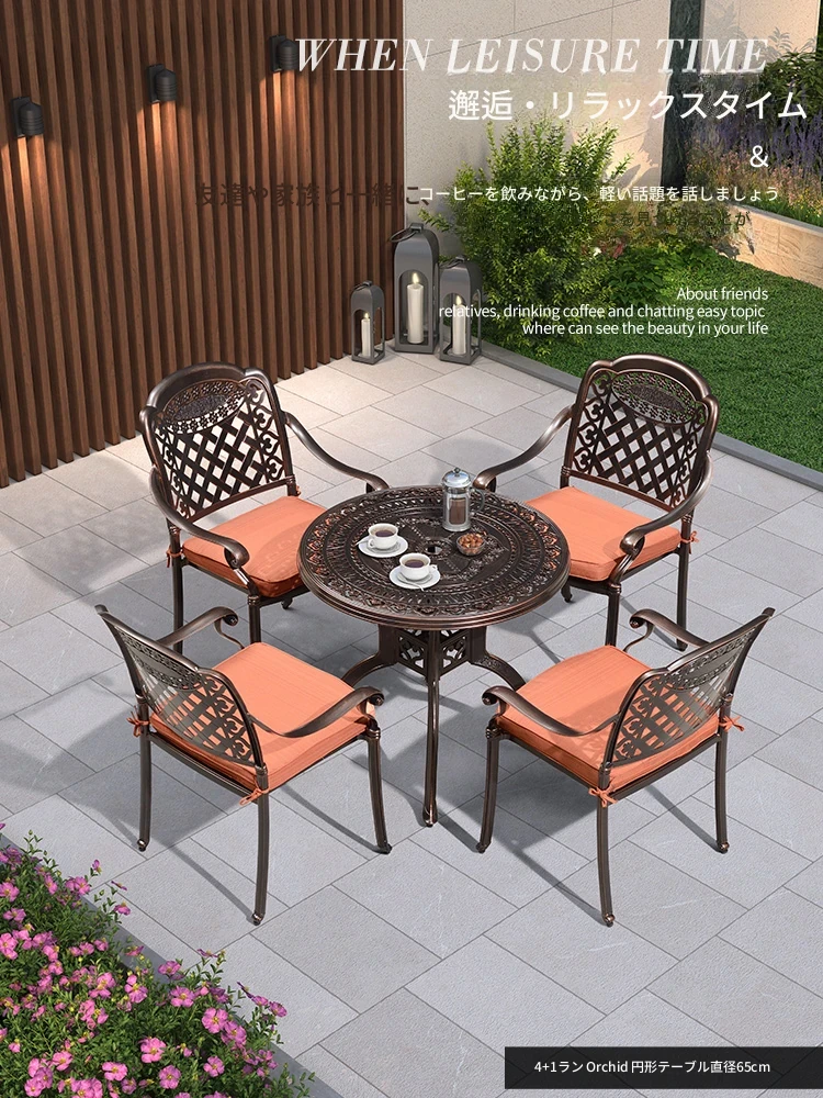 紫葉のアウトドアテーブル&チェアセット - 鋳造アルミ製の庭用アイアンデザイン、広々としたレジャー長テーブルで、あなたの庭やバルコニーをスタイリッシュに演出します!