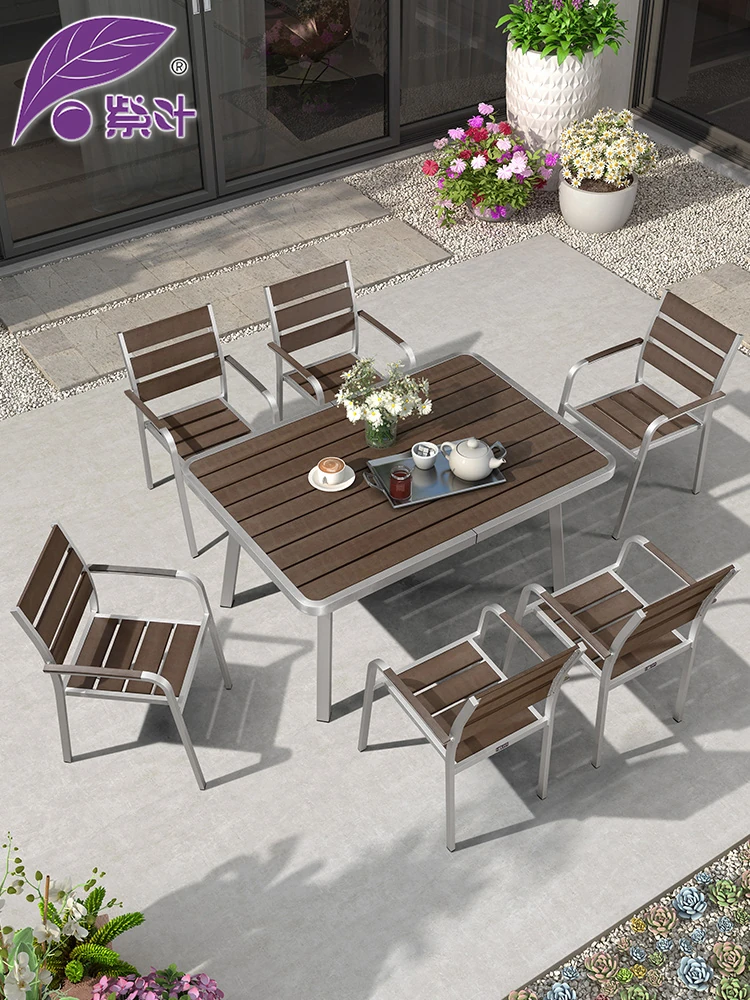 紫葉アウトドアテーブルセット - アルミ合金製のスタイリッシュなダイニングテーブルとチェア、庭やバルコニーに最適なプラスチック木材製のリラックスチェア。美しいデザインで、心地よいひとときをお楽しみください!