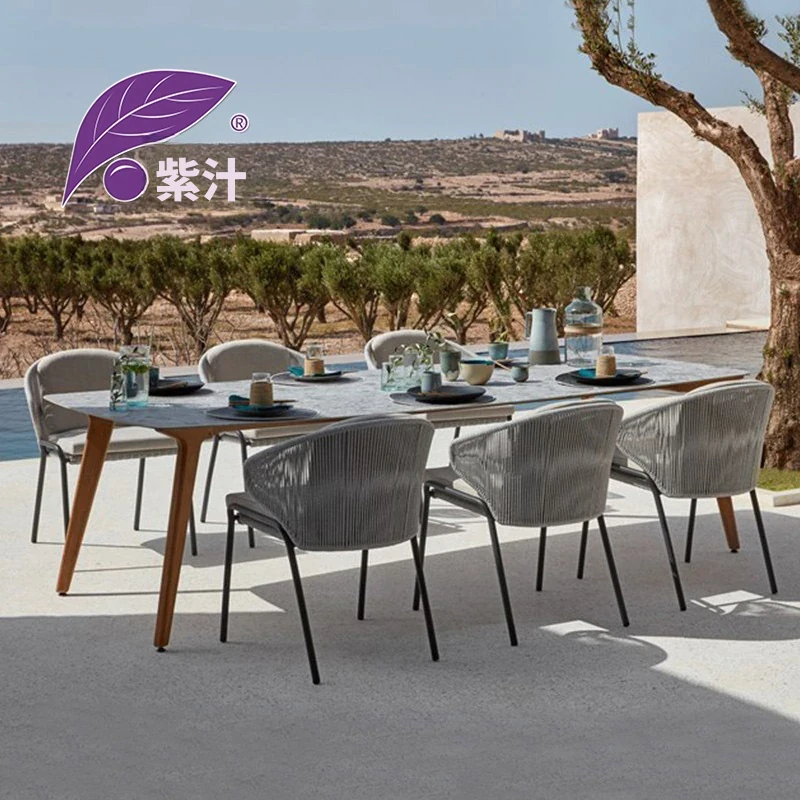 紫色の葉のアウトドアリラックス用テーブルセット - ヴィラのテラスにぴったりなカジュアルダイニングテーブルとラタンチェアのコンビネーション、ガーデンやオープンエアに最適な心地よいひとときを演出!