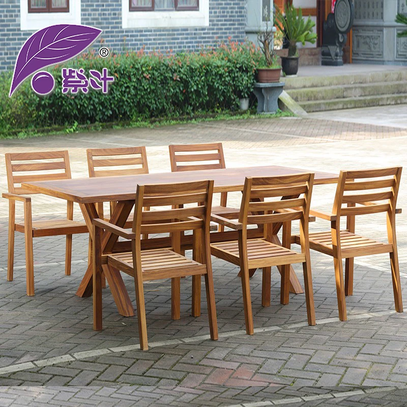 紫色の葉のアウトドア用無垢材テーブル&チェアセット - 庭やバルコニーにぴったりな長テーブルとリラックスチェア。高品質ティーク材使用で耐久性抜群、スタイリッシュなデザインで贅沢なひとときをお届けします!