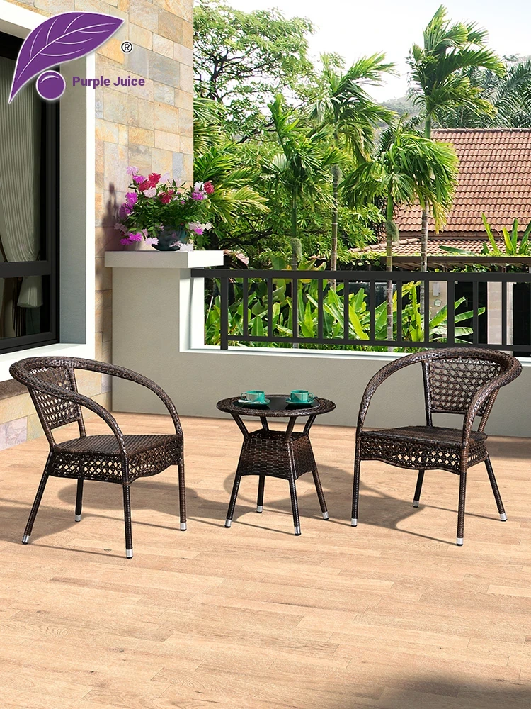 Purple Leaf Outdoor Rattan Table and Chairs Set - 3-Piece Modern Minimalist Balcony Furniture with European-Style Tea Table and Rattan Chairs for Home Use