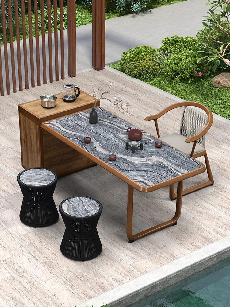 紫色の葉のアウトドア庭用テーブルセット - 禅の心を感じる新中華風ティーテーブル&椅子一体型、理想の茶会を演出する泡茶テーブル!