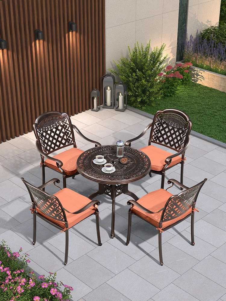 紫色葉の鋳造アルミニウム製アウトドアテーブル&チェアセット - 雨や日差しから守るガーデン用アイアンテーブル、リラックスできるテラス用ダイニング家具。あなたの庭をおしゃれに彩る、耐久性抜群の選択肢です!
