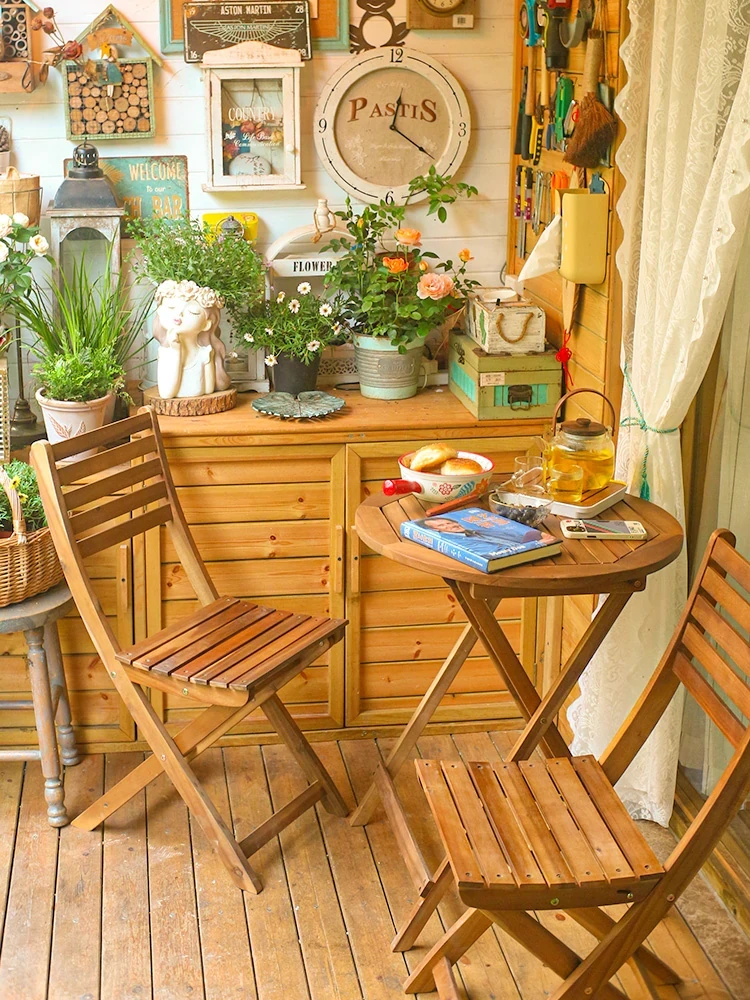 紫色の葉のバルコニー用小型テーブル&チェアセット - 折りたたみ式でシンプルなデザイン、アウトドアや庭に最適!防腐加工された木製の3点セットで、快適なリラックスタイムをお楽しみください。