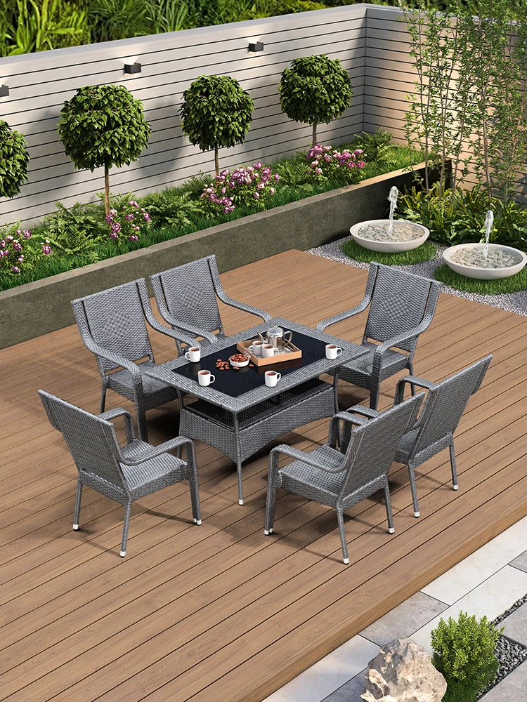 紫葉ガーデンチェアテーブルセット - 屋外リラックスチェア、別荘用の庭テーブル、長いダイニングテーブルと椅子、テラス用ラタンチェアで贅沢なひと時を。快適さとスタイルを兼ね備えたアウトドア家具で、優雅な空間を演出します!